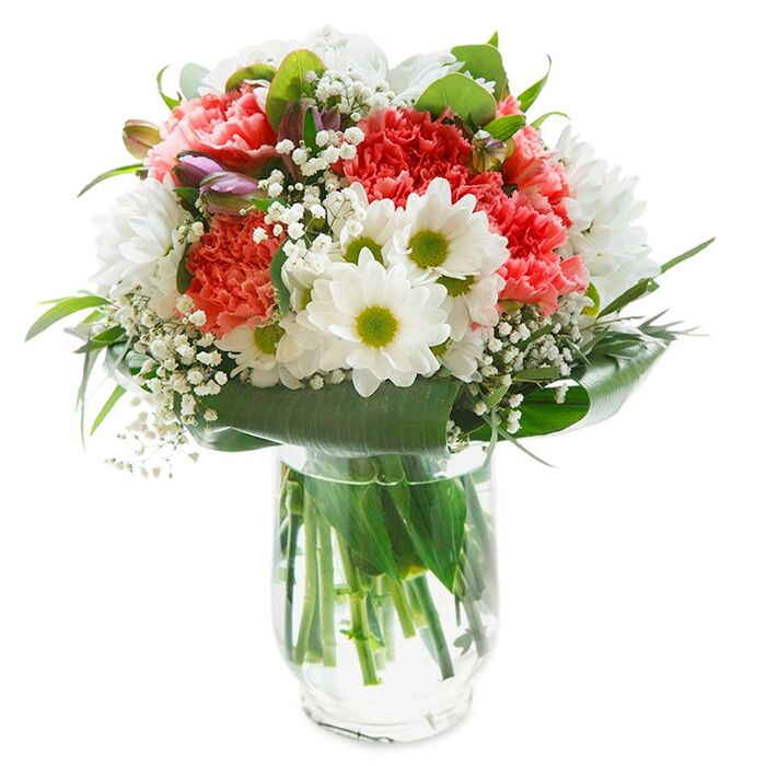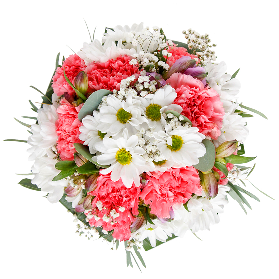 Embrace the art of gifting with our luxurious floral arrangement designed to captivate the senses. Expertly curated and hand-picked at the peak of bloom, this bouquet unites the purity of snow-white chrysanthemums, the gentle allure of gypsophila, and the softness of light pink carnations, enhanced by rich aspidistra leaves.